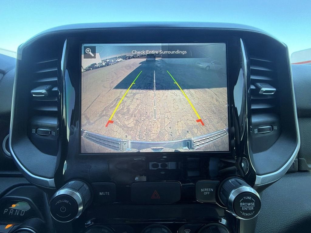 Inside, the cabin is thoughtfully designed with the Big Horn Level 1 Equipment Group, featuring an 8.4-inch Uconnect touchscreen display with navigation, Apple CarPlay, Android Auto, 4G LTE Wi-Fi hotspot, and SiriusXM services. Comfort comes from power-adjustable driver seats with lumbar support, dual-zone climate control, heated mirrors, and a leather-wrapped steering wheel. Storage and convenience are abundant with in-floor rear bins, rear power sliding window, and a center armrest with storage. The exterior impresses with chrome bumpers, 18-inch cast-aluminum wheels, and optional 20-inch chrome-clad wheels for a bold presence on the road.